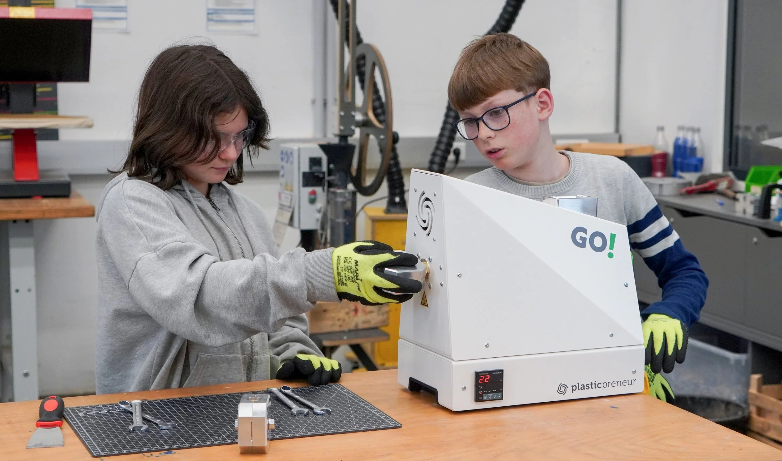 Discover the GO! Series — the ideal entry point for exploring the world of plastic recycling. Built to be portable, simple, and ready-to-go, these machines allow educators to bring the circular economy directly into the classroom or lab. The series provides hands-on access to plastic as a versatile raw material, allowing students to explore its properties — with all its advantages and challenges—and transform it into something entirely new. Coupled with our comprehensive experiment kits and teaching materials, it is the ultimate all-in-one educational system.